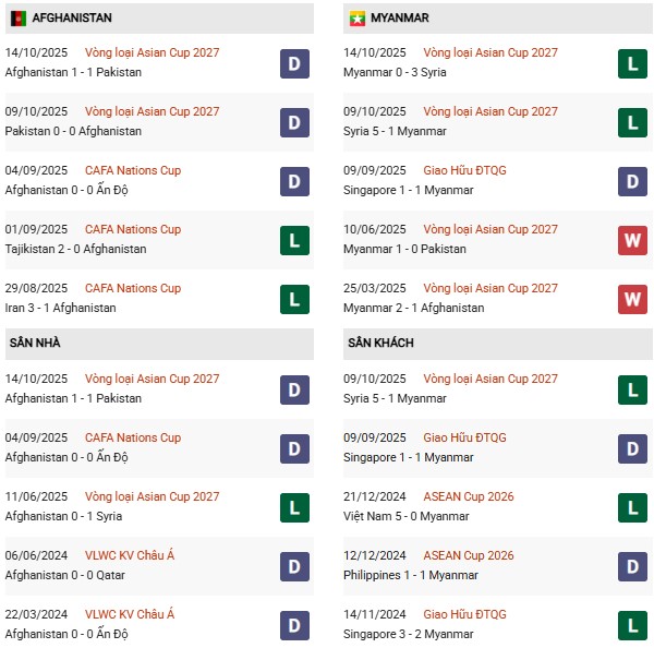 Phong độ gần đây của Afghanistan là khá thất vọng khi họ chưa thắng trận nào, chủ yếu hòa và thua, hàng công thiếu sắc bén với chỉ 2 bàn sau 4 trận. Lối chơi của họ thiên về phòng ngự nhưng lại thiếu sự chắc chắn ở những thời điểm quyết định. Ngược lại, Myanmar dù không quá ổn định nhưng đã cho thấy khả năng tận dụng cơ hội tốt hơn. Hai chiến thắng trước Pakistan và Afghanistan ở lượt đi là minh chứng cho sự hiệu quả trong cách tiếp cận trận đấu của họ.