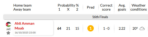 Nhìn vào tổng thể, Al Ahli Amman vẫn có lợi thế rõ ràng trong cuộc đối đầu này. Dù phong độ chưa thật sự ổn định, sự vượt trội về mặt tinh thần, lợi thế sân nhà và chất lượng đội hình vẫn giúp họ được các chuyên gia đánh giá cao hơn. Moab Club nhiều khả năng sẽ gặp khó khăn trong việc giành điểm, và kịch bản Al Ahli Amman có ít nhất 1 điểm là hoàn toàn khả thi.