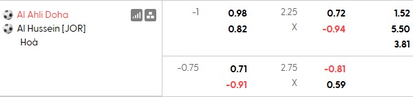 Mức chấp 1 bàn cho thấy Al Ahli Doha được đánh giá nhỉnh hơn. Với lợi thế sân nhà cùng kinh nghiệm thi đấu ở đấu trường châu lục, đại diện Qatar có cơ sở để giành chiến thắng. Tuy nhiên, Al Hussein Irbid không phải đối thủ dễ bị khuất phục.