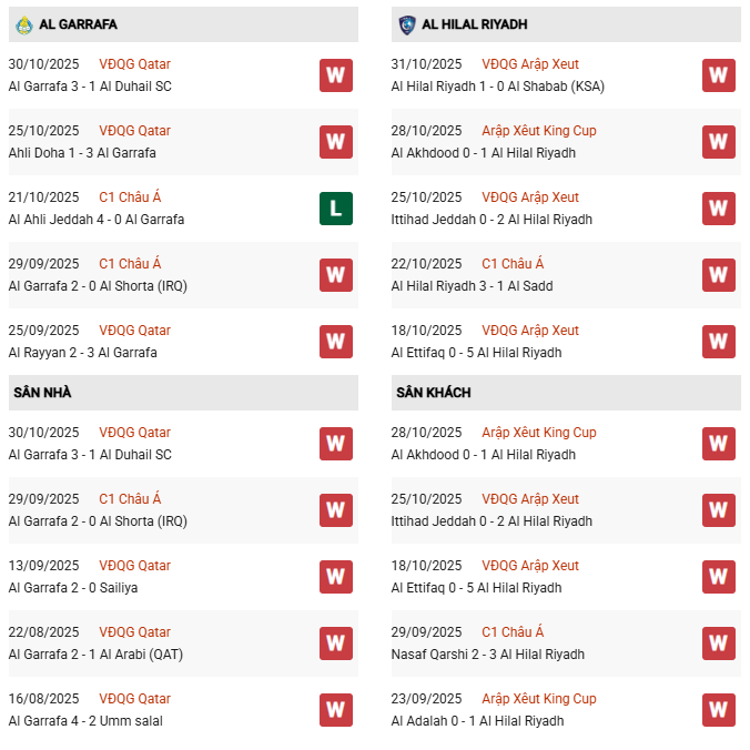 - Trong 4 trận gần nhất, Al Gharafa thua 4. Trong khi đó, Al Hilal thắng 4.
