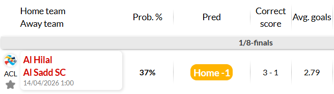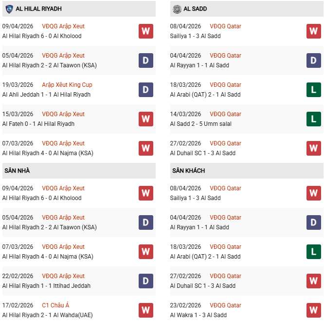 Trong lịch sử đối đầu gần đây tại vòng bảng vào tháng 10/2025, Al Hilal đã đánh bại Al Sadd thuyết phục với tỷ số 3-1. Với phong độ đang vào phom cùng sự cổ vũ của khán giả nhà, kịch bản về một chiến thắng cách biệt cho Al Hilal là điều được giới chuyên môn dự báo.