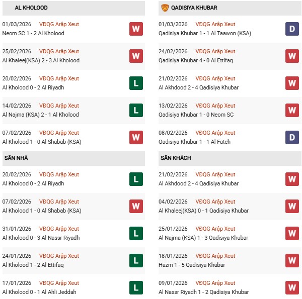 - Trên sân nhà, Al Kholood thắng 1, thua 2 trước Al Qadisiya.