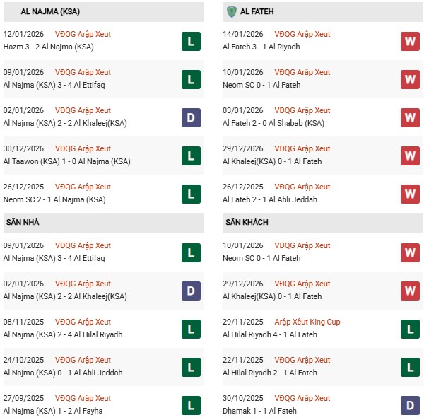 Phong độ gần đây của Al Fateh khá tích cực với 6 chiến thắng và 4 thất bại trong 10 trận gần nhất, phản ánh lối chơi có phần thực dụng nhưng hiệu quả. Trên sân khách, họ thắng 3, hòa 2 và thua 5 trong 10 chuyến hành quân gần đây – không quá nổi bật nhưng đủ để tạo niềm tin khi đối đầu một đối thủ yếu như Al Najma. Với chất lượng đội hình và kinh nghiệm vượt trội, Al Fateh được kỳ vọng sẽ biết cách tận dụng cơ hội.