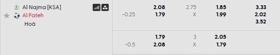 Al Fateh chấp 1/4 bàn cả trận. Dù phải thi đấu trên sân khách, sự chênh lệch lớn về phong độ và đẳng cấp khiến Al Fateh vẫn được đánh giá cao hơn. Trong bối cảnh Al Najma gần như không có điểm tựa tinh thần, lựa chọn Al Fateh ở kèo chấp nhẹ này là phương án hợp lý.
