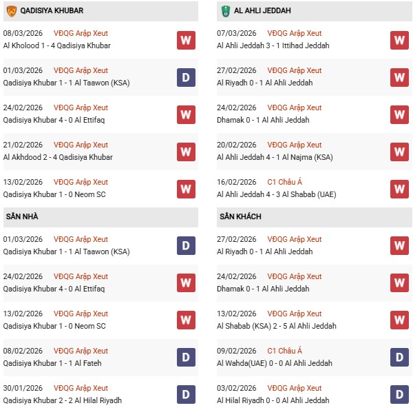 - Al Qadisiya thắng 2, hòa 2, thua 6 trong 10 trận gặp Al Ahli gần đây.