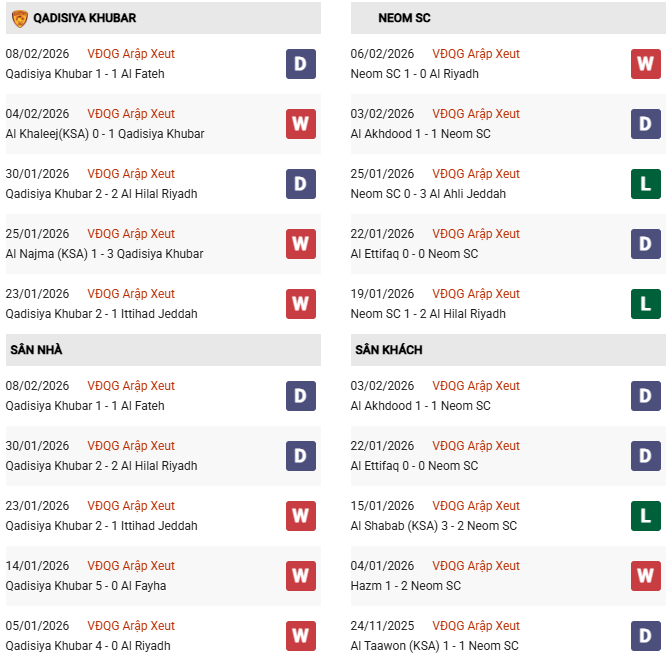 Càng có lý do để tin vào một chiến thắng dành cho Al Qadsiah ở trận này nếu nhìn vào lần chạm trán duy nhất giữa 2 đội trước đó ở lượt đi tại Saudi Pro League mùa này. Cụ thể, Al Qadsiah đã dễ dàng giành thắng lợi 3-1 ngay trên sân của Neom SC, trong ngày chân sút Julian Andres Quinones lập 1 cú hat-trick.