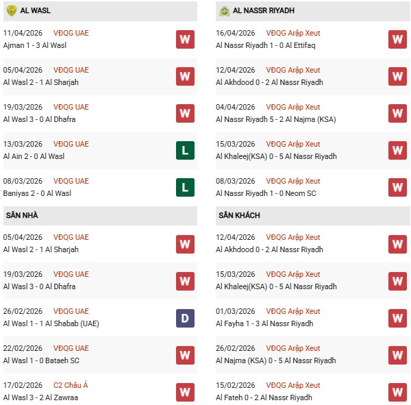 - Trên sân nhà, Al Wasl thắng cả 2 trận trước Al-Nassr.