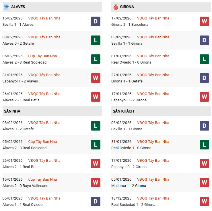 Girona cũng không hề yếu bóng vía trên sân khách. Trong 5 chuyến hành quân trở lại đây, họ chỉ phải nhận 1 thất bại, còn lại hòa 1 và giành 3 chiến thắng. Điều này sẽ giúp họ thêm tự tin khi hành quân đến sân của Alaves.