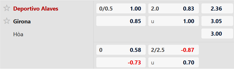 Tối thiểu 1 bàn hiệp 1: 6/8 lần gặp giữa 2 đội gần đây đều có từ 1 bàn thắng trở lên trong hiệp 1. Tình trạng tương tự xảy ra ở 4/5 trận gần đây của Alaves và 7/8 trận sân khách vừa qua của Girona.
