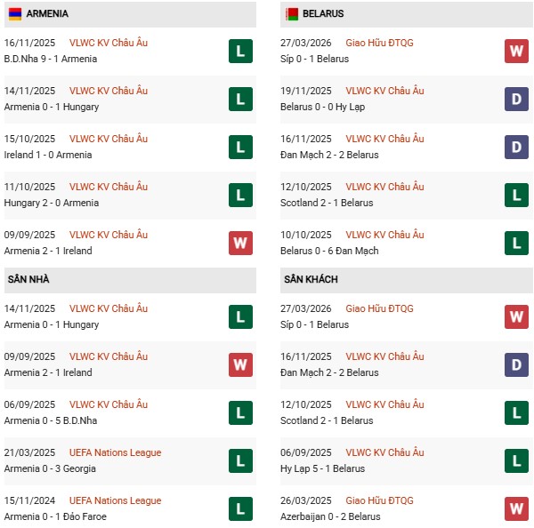 - Trên sân nhà, Armenia thắng 1, thua 2 trước Belarus.