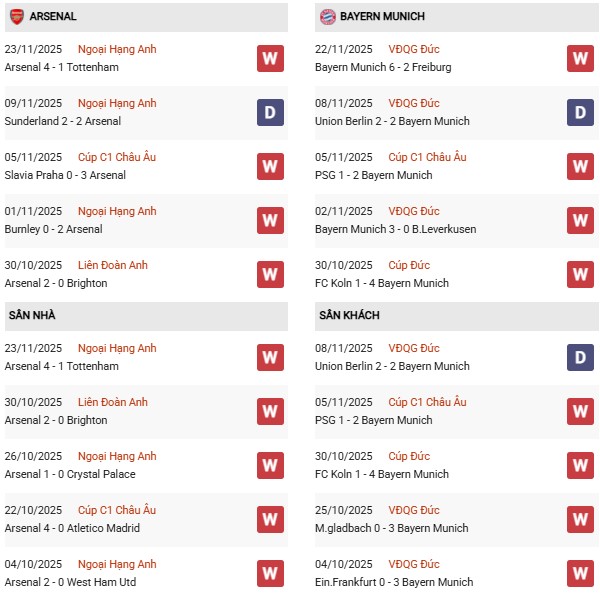 5 lần gần đây chạm trán với Arsenal trong khuôn khổ Champions League, Bayern Munich áp đảo gần như tuyệt đối. Thế nên, sẽ không bất ngờ nếu Bayern Munich đánh bại Arsenal ở trận này để tiếp tục dẫn đầu bảng xếp hạng vòng phân hạng Champions League.