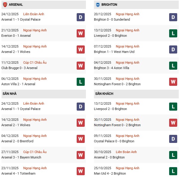 Ở 5 cuộc đối đầu gần nhất với Brighton, Arsenal đều bất bại, trong đó có 3 chiến thắng và 2 trận hòa. Điều này củng cố thêm niềm tin chiến thắng cho Pháo thủ trước một Chim mòng biển đang chao đảo với chuỗi 4 trận không thắng (2 hòa, 2 bại) và lối chơi thiếu hiệu quả. Phong độ thiếu ổn định, những vấn đề trong phòng ngự gần đây và hàng công không hiệu quả của Brighton khiến họ lép vế so với chủ nhà Arsenal ở cuộc đối đầu này.
