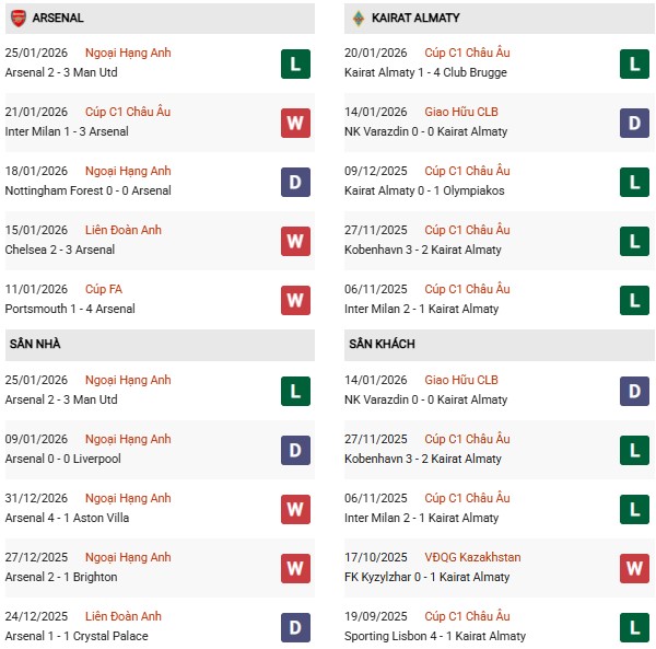 Chỉ 1 đội ghi bàn: Arsenal đã toàn thắng cả 7 trận tại vòng phân hạng Champions League mùa này và trên hết, có tới 5 lần họ giữ sạch lưới. Trái ngược với hàng thủ "mơ ngủ" ở giải quốc nội, Pháo thủ đã chơi rất chắc chắn ở cúp châu Âu. Trên sân nhà, Arsenal đã ghi bàn ở 18/19 trận gần nhất. Trong khi đó, Kairat Almaty có tới 3 trận không ghi bàn ở Champions League mùa này.
