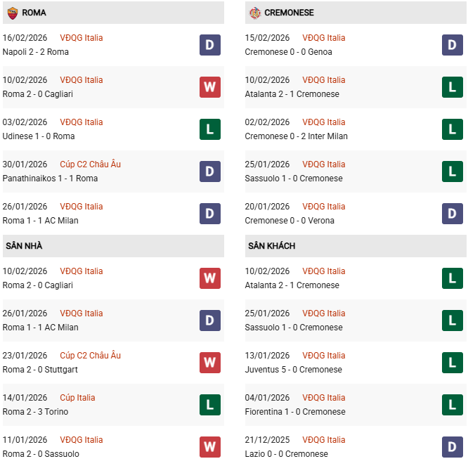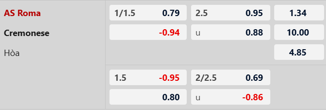 - Trên sân nhà, AS Roma thắng 2, thua 1 trước Cremonese.