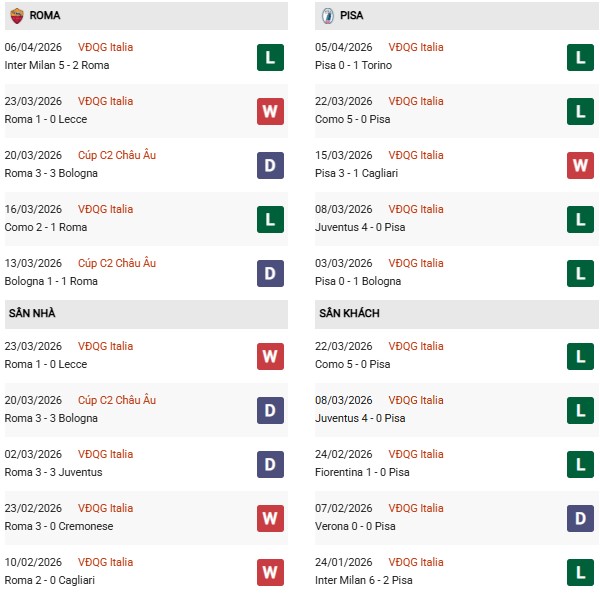 Đáng nói hơn, khả năng thi đấu sân khách của Pisa gần như không có điểm sáng. Họ đã thua liên tiếp nhiều chuyến xa nhà, hàng công nghèo nàn trong khi hàng thủ lại thường xuyên mắc sai lầm. Điều này khiến Pisa khó có thể tạo nên bất ngờ trước một Roma đang rất khát điểm.