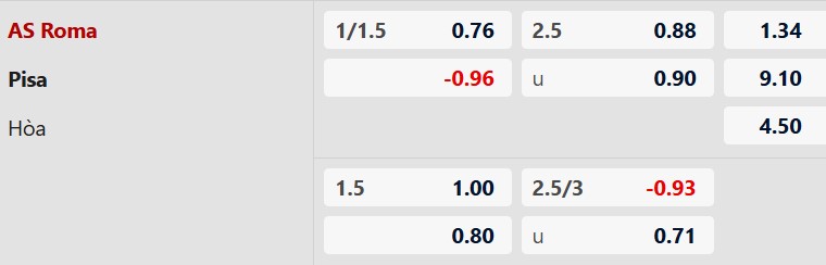 Mức chấp 1 1/4 bàn cho thấy đánh giá khá cao khả năng thắng cách biệt của Roma. Đây là điều hợp lý khi xét đến sự chênh lệch về đẳng cấp, động lực và lợi thế sân nhà. Dù phong độ chưa thực sự ổn định, nhưng trước một đối thủ yếu như Pisa, Roma hoàn toàn có thể giành chiến thắng với cách biệt từ 2 bàn trở lên.