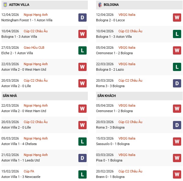 - Aston Villa toàn thắng cả 3 trận đối đầu Bologna gần đây.