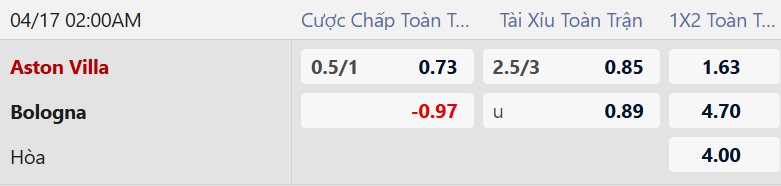 Aston Villa chấp 3/4 bàn là mức kèo hợp lý khi họ vừa có lợi thế sân nhà, vừa nắm lợi thế lớn sau lượt đi. Với lối chơi thực dụng nhưng hiệu quả, đội bóng của Unai Emery đủ khả năng giành thêm một chiến thắng trước Bologna.