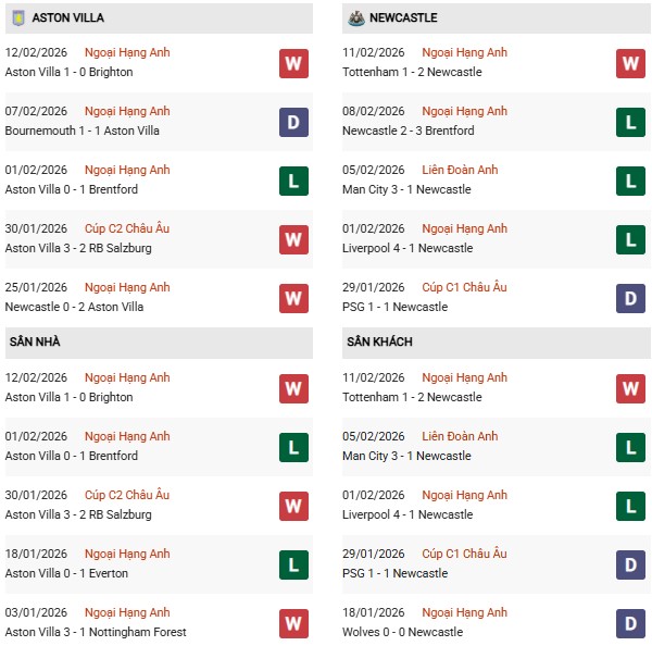 - Trên sân nhà, Aston Villa thắng 5, thua 1 trước Newcastle.