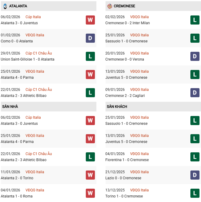 Phong độ sân khách của Cremonese thậm chí còn tệ hơn; họ đã thua 4/5 chuyến hành quân xa nhà gần nhất. Việc phải đối đầu với một Atalanta đang thăng hoa trên sân nhà là một thử thách quá sức đối với hàng thủ lỏng lẻo của Cremonese, đặc biệt khi họ đang mất đi những trụ cột quan trọng vì chấn thương.