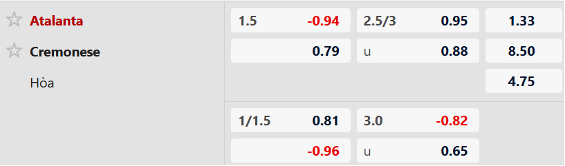 Lịch sử đối đầu cũng nghiêng hẳn về phía đội chủ nhà. Trong 5 lần chạm trán gần nhất, Atalanta thắng 3, hòa 1 và chỉ thua 1 trận. Với việc chấp 1.5 trái, Atalanta vẫn là lựa chọn an toàn khi họ thường xuyên thắng cách biệt trên sân nhà. Chuyên gia tin tưởng Atalanta sẽ là đội thắng kèo.