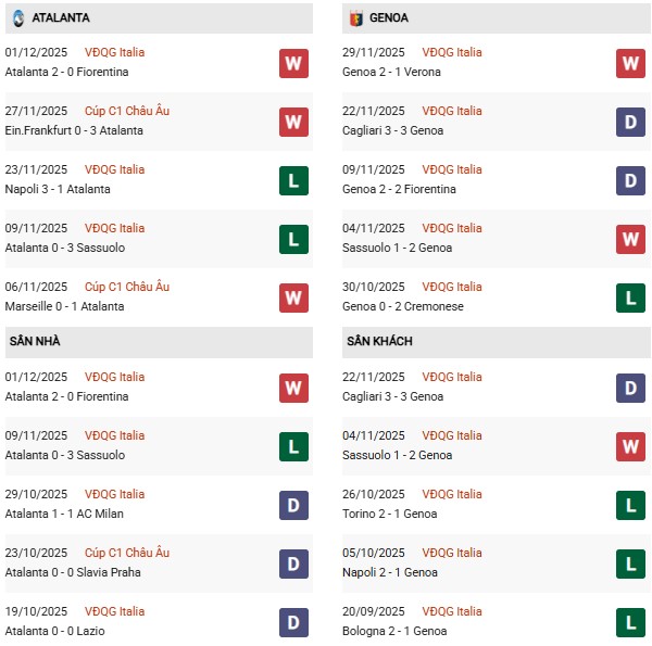 2 mùa giải đã qua chứng kiến sự vượt trội hoàn toàn của Atalanta về thành tích đối đầu khi họ đánh bại Genoa ở cả 4 lần chạm trán tại Serie A. Có thể thấy, Genoa chưa bao giờ được xem là đối thủ xứng tầm với Atalanta. Với lợi thế sân nhà, thầy trò HLV Raffaele Palladino đủ sức giành chiến thắng để giành vé vào vòng đấu dành cho 8 đội mạnh nhất tại Coppa Italia.
