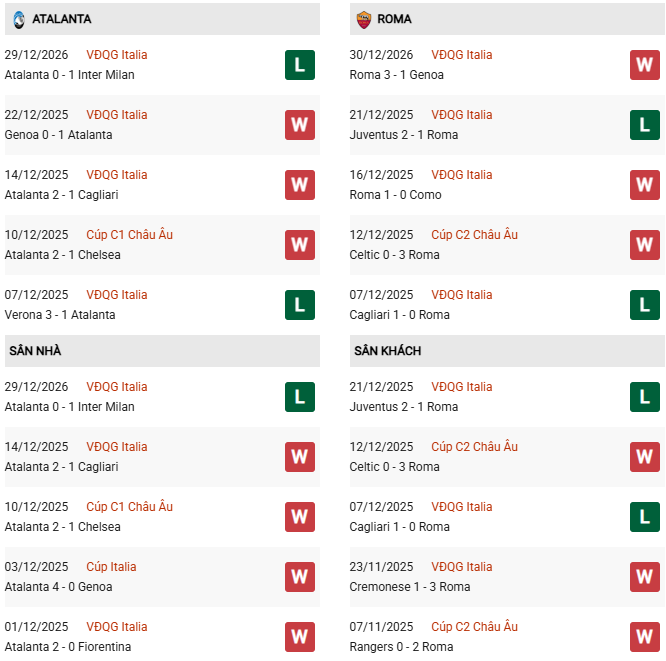 - Trên sân nhà, Atalanta thắng 6, thua 2 trước Roma.