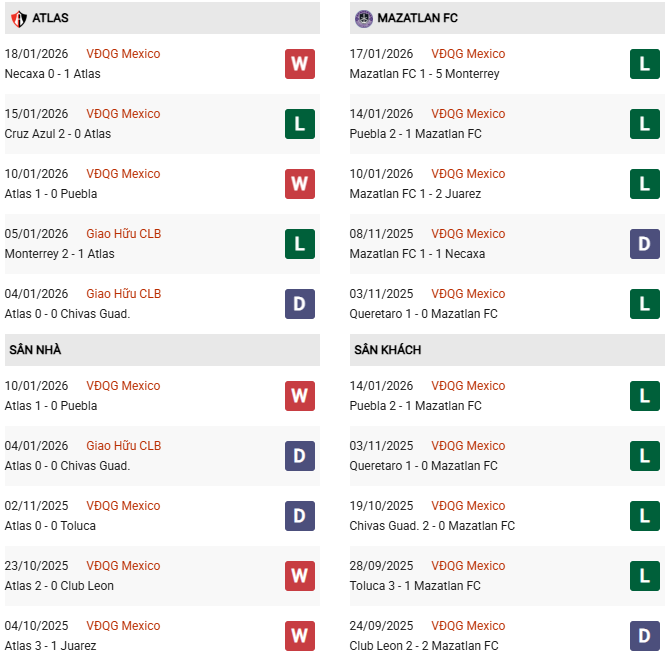 - Atlas thắng 2, hòa 2, thua 6 trong 10 trận gặp Mazatlan gần đây.