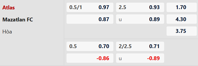 Thông tin tỷ lệ Atlas vs Mazatlan: