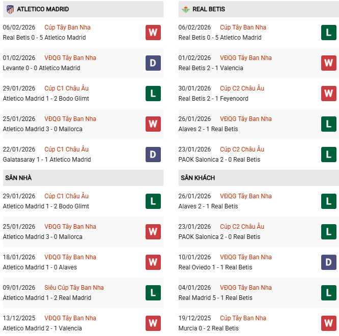 Về phía Real Betis, thất bại với cách biệt 5 bàn trước Atletico tại Copa del Rey vừa qua là một kết quả gây sốc, và đội bóng thành Seville sẽ nỗ lực tìm kiếm màn trả thù trong trận tái đấu này.