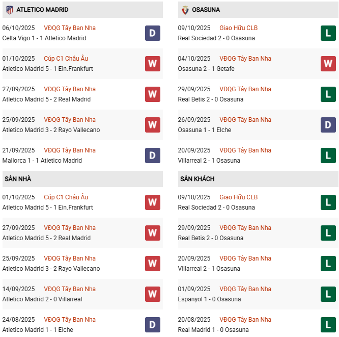 Dẫu vậy, Atletico không thể xem nhẹ Osasuna. Ba lần gặp nhau gần nhất, Simeone và các học trò đã để thua tới 2, bao gồm thất bại 0-2 trong cuộc chạm trán cuối mùa trước. Càng đáng nhớ hơn là trận thua 1-4 ngay tại Wanda Metropolitano hồi tháng 5/2024 – một kết quả khiến người hâm mộ đội bóng thủ đô đầy bất ngờ.