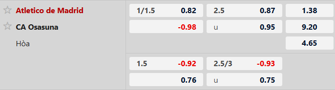 Atletico Madrid được đánh giá cao hơn và chấp 1 1/4 bàn cả trận. Lịch sử đối đầu hoàn toàn ủng hộ đội bóng của HLV Diego Simeone khi họ đã thắng tới 12 trong 14 lần gặp nhau gần nhất. Dù Osasuna vẫn cho thấy họ không phải đối thủ dễ bị khuất phục khi giành tới 2 chiến thắng trong 3 lần đối đầu gần đây. Tuy nhiên, trong bối cảnh Atletico đang cần điểm để bám đuổi nhóm, nhiều khả năng thầy trò Simeone sẽ kiểm soát thế trận và giành chiến thắng cách biệt từ 2 bàn trở lên.