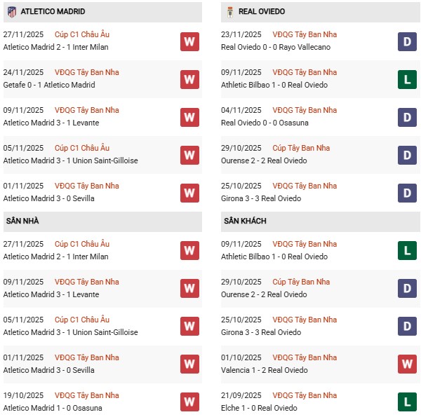 - Atletico Madrid toàn thắng cả 2 trận đối đầu Oviedo gần đây.