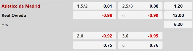 Atletico Madrid hiển nhiên được đánh giá cao hơn ở trận này. Mức kèo được niêm yết khi chủ nhà chấp tới -1 3/4 theo handicap. Phong độ của Atletico Madrid vs Oviedo cũng đang rất chênh lệch. Hơn nữa, Atletico có lợi thế sân nhà, kinh nghiệm và đội hình cực mạnh. Do đó, nhiều khả năng, họ sẽ có niềm vui trước đội khách.