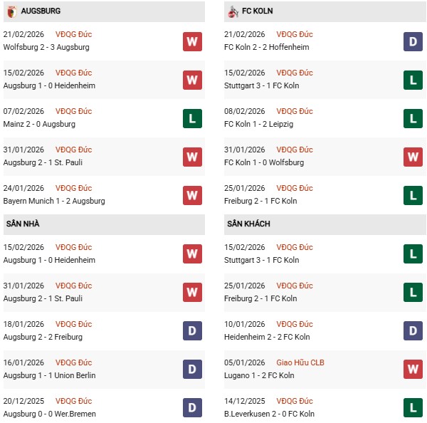 - Augsburg thắng 2, hòa 4, thua 4 trong 10 trận gặp Cologne gần đây.