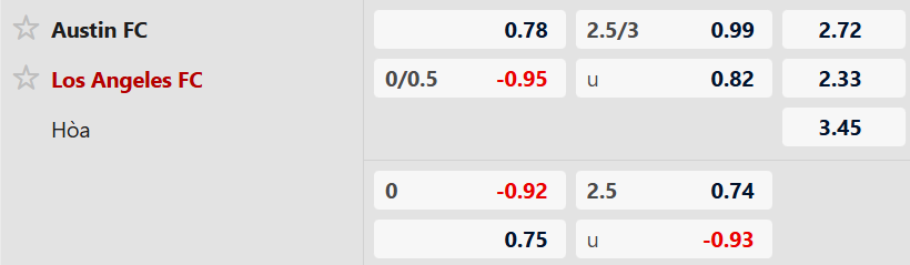 Sàn giao dịch châu Á ghi nhận mức kèo 0:0, tỷ lệ mà ở trận đối đầu gần nhất xuất hiện Los Angeles FC là đội giành chiến thắng. Với thành tích thắng kèo châu Á 3 trân liên tiếp gần đây, LAFC đang tự tin làm khách tới sân của Austin, đội cũng toàn thua kèo 3 trận vừa qua.