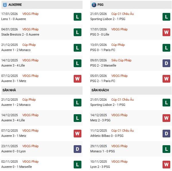 - Trên sân nhà, Auxerre thắng 1, thua 4 trước PSG.