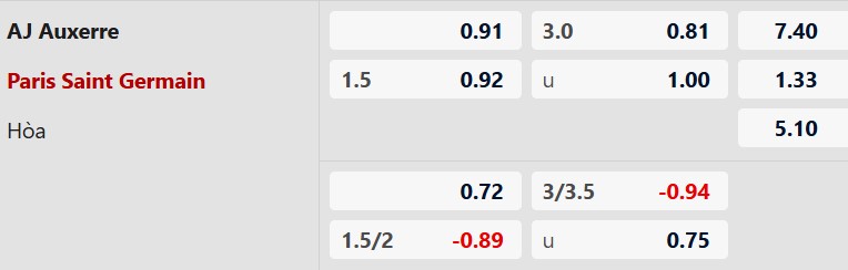 Hiệp 1 tối đa 1 bàn: 8/9 trận đối đầu gần nhất đều khép lại hiệp 1 với không quá 1 bàn thắng. Ngoài ra, 8/11 trận gần nhất của Auxerre và 6/7 trận gần đây của PSG đều có tối đa 1 bàn thắng trong hiệp 1. Trận này khó có ngoại lệ.