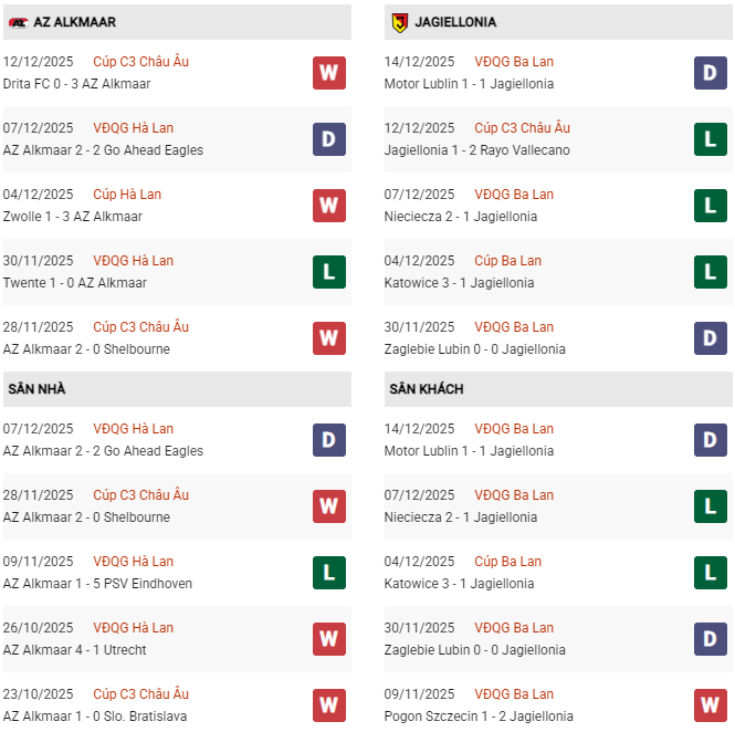 Jagiellonia Bialystok cũng đang cạnh tranh quyết liệt cho suất đi tiếp. Họ từng gây ấn tượng với các trận hòa trên sân Strasbourg và Shkendija, cùng chiến thắng trước Hamrun Spartans và KuPS. Tuy nhiên, thất bại 1-2 trước Rayo Vallecano ở vòng trước khiến đại diện Ba Lan rơi khỏi nhóm hạt giống. Để nuôi hy vọng, Jagiellonia buộc phải thắng ngay tại Hà Lan – nhiệm vụ không hề dễ dàng.
