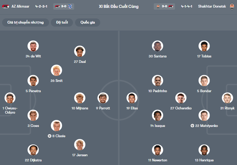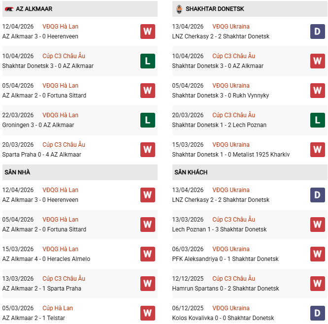 - AZ Alkmaar thắng 2, hòa 1, thua 1 trong 4 trận gặp Shakhtar Donetsk gần đây.