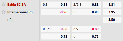 Bahia được đánh giá cao hơn ở trận này với mức chấp -1/2 theo handicap. Xét bối cảnh tổng thể, Bahia với sự ổn định cao trên sân nhà vẫn xứng đáng được tin tưởng hơn là một Internacional sa sút thấy rõ đặc biệt khi phải làm khách.