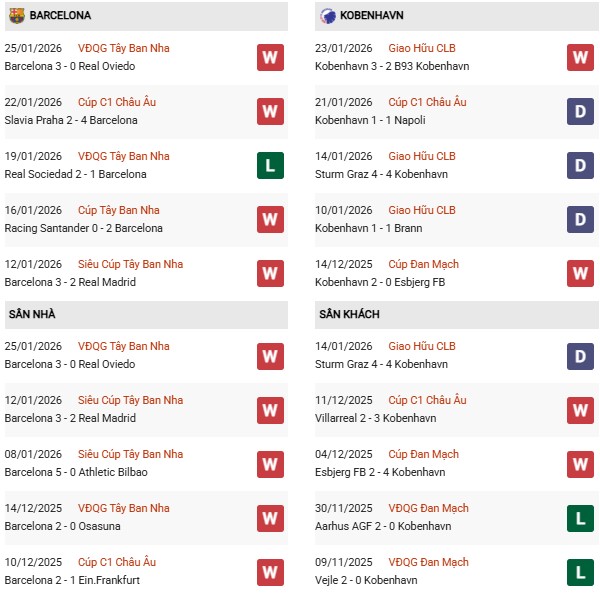 - Barcelona thắng 1, hòa 1 trong 2 trận gặp Copenhagen gần đây.