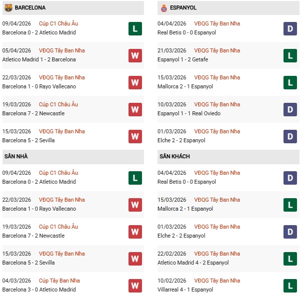 - Trên sân nhà, Barcelona thắng 7, thua 1 trước Espanyol.