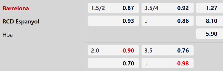 Mức chấp 1 3/4 bàn thể hiện sự chênh lệch lớn giữa hai đội. Với phong độ sân nhà ấn tượng cùng hàng công bùng nổ, Barcelona hoàn toàn có thể tạo ra chiến thắng cách biệt. Trong khi đó, Espanyol đang sa sút và khó có thể đứng vững trước sức ép liên tục từ đội đầu bảng.