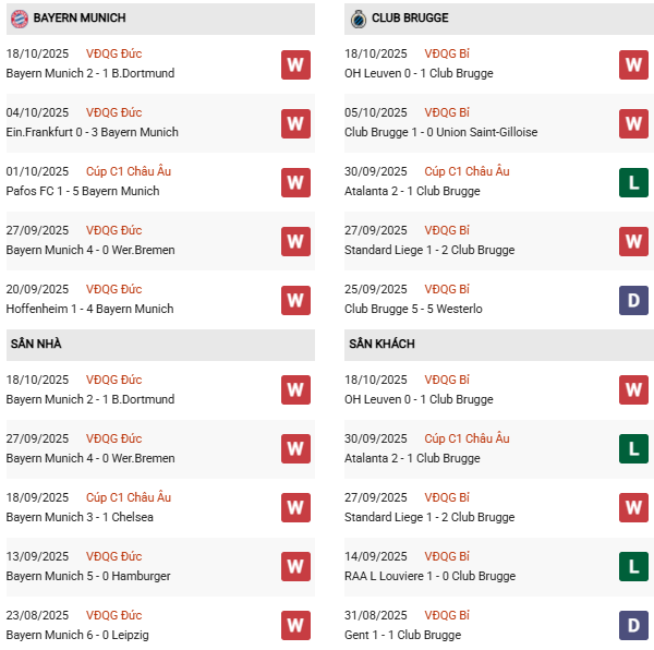 Trở lại sân chơi châu Âu, Brugge chắc chắn vẫn chưa quên chuyến làm khách trên sân Atalanta, nơi họ để thua 1-2 dù đã dẫn trước. Thành tích sân khách gần đây của đại diện Bỉ cũng không mấy khả quan, với 2 thắng, 2 thua và 1 hòa trong 5 trận gần nhất. Dẫu vậy, Brugge vẫn có cơ sở để hy vọng. Họ đã ghi bàn trong 13 trận sân khách liên tiếp và nếu tiếp tục giữ được hàng thủ kỷ luật như hai trận gần nhất, họ có thể trở thành đội bóng đầu tiên khiến Bayern mất điểm mùa này.