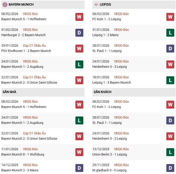 - Trên sân nhà, Bayern Munich thắng 6, thua 2 trước Leipzig.