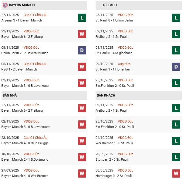- Trên sân nhà, Bayern Munich thắng cả 2 trận trước St.Pauli.
