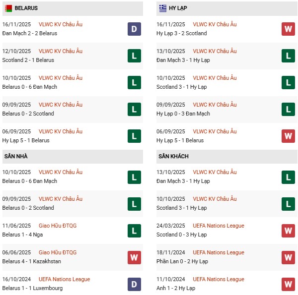 Lịch sử đối đầu gần đây cũng nghiêng về Hy Lạp. Trong lần gặp nhau gần nhất vào ngày 05/09/2025, Hy Lạp giành chiến thắng 5-1 trước Belarus. Trận đấu đó chứng kiến màn trình diễn áp đảo của Hy Lạp với 64% thời gian kiểm soát bóng và 30 cú sút, trong khi Belarus chỉ có 11 cú sút với 4 lần trúng đích.