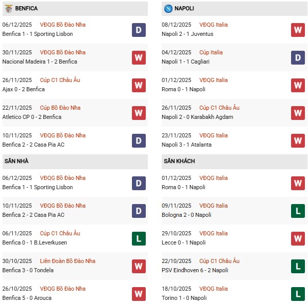 - Trên sân nhà, Benfica thắng 1, thua 1 trước Napoli.