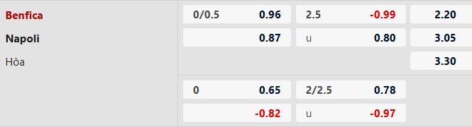 Dưới 3 bàn: 3/4 trận gần đây của Benfica đều có dưới 3 bàn. 3/4 trận gần nhất của Napoli số lần lưới rung cũng chỉ tối đa là 2.